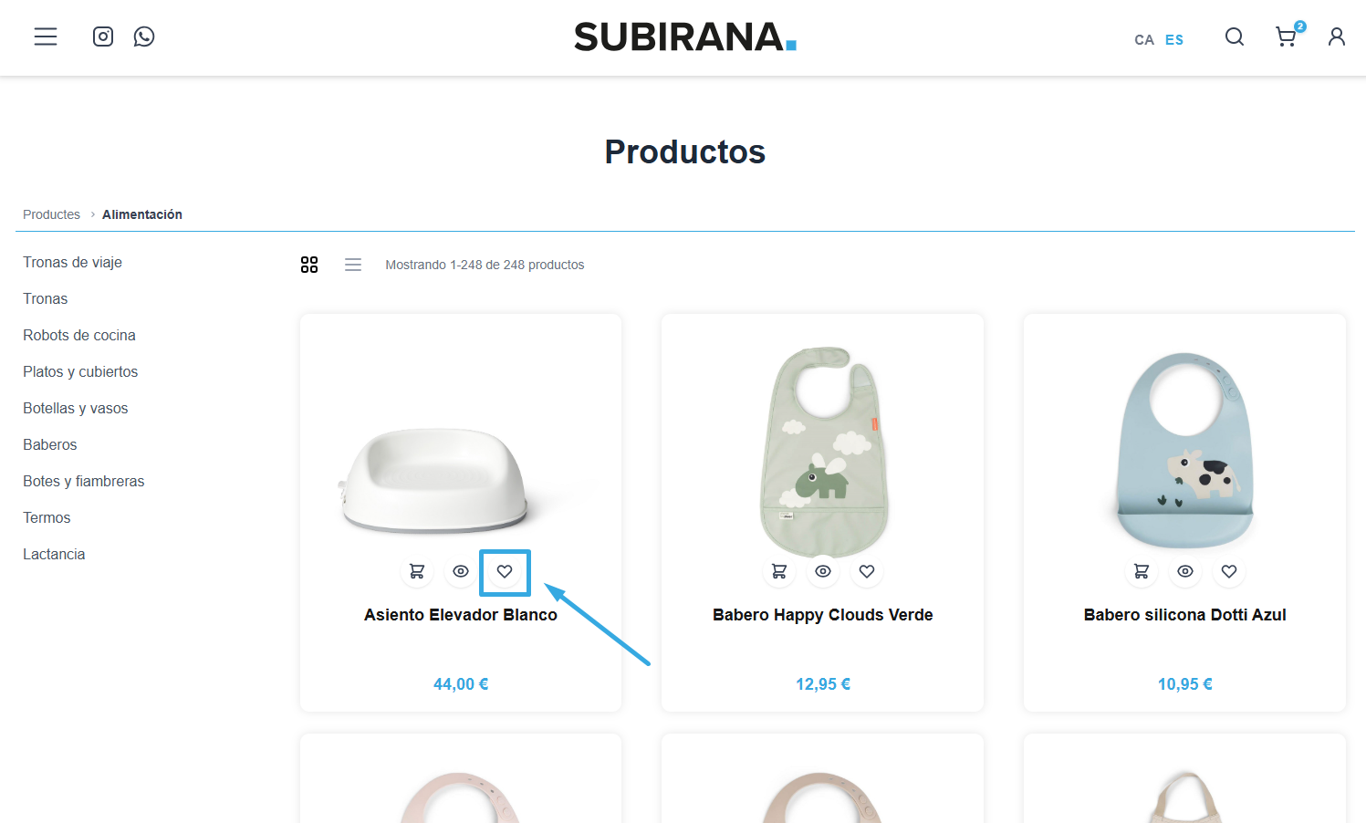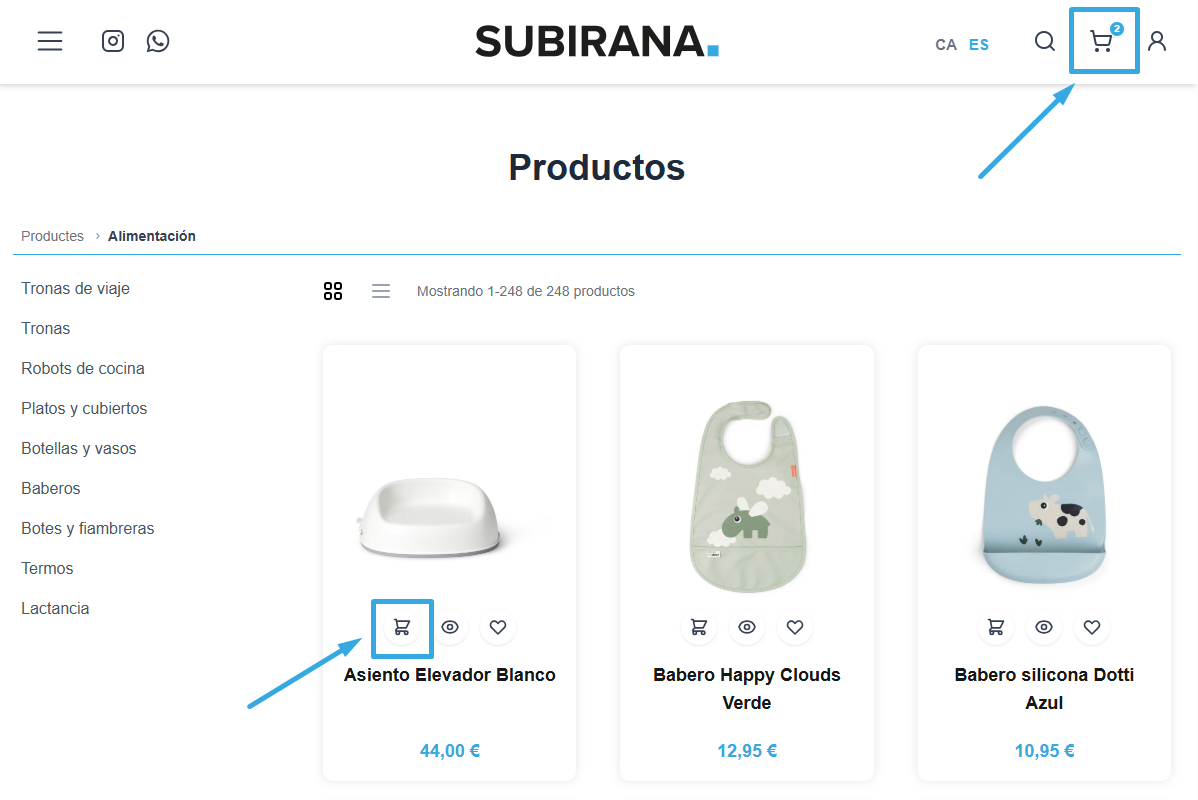 - Selecciona los productos y añádelos al carrito de compra. Verás que en el icono del carrito aparece un número.