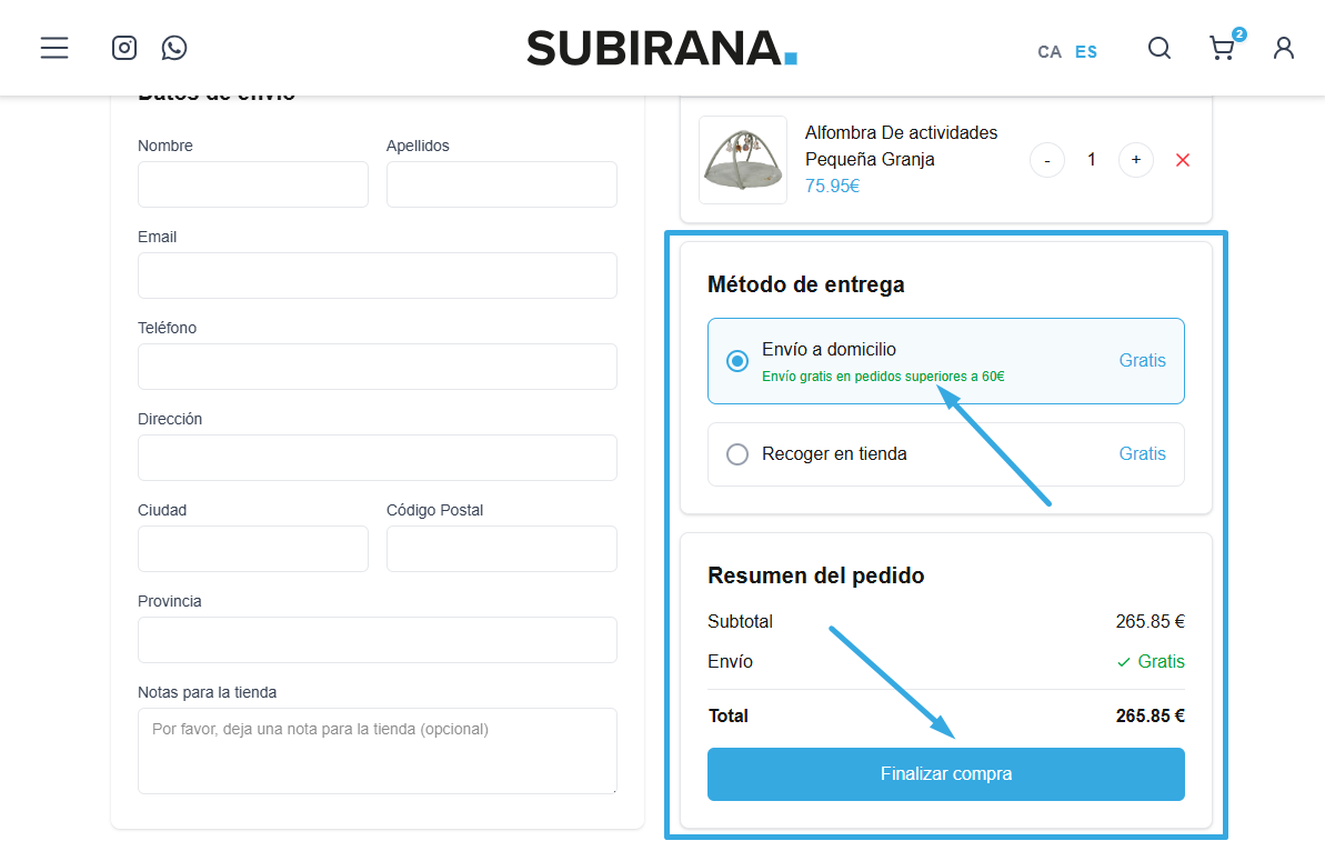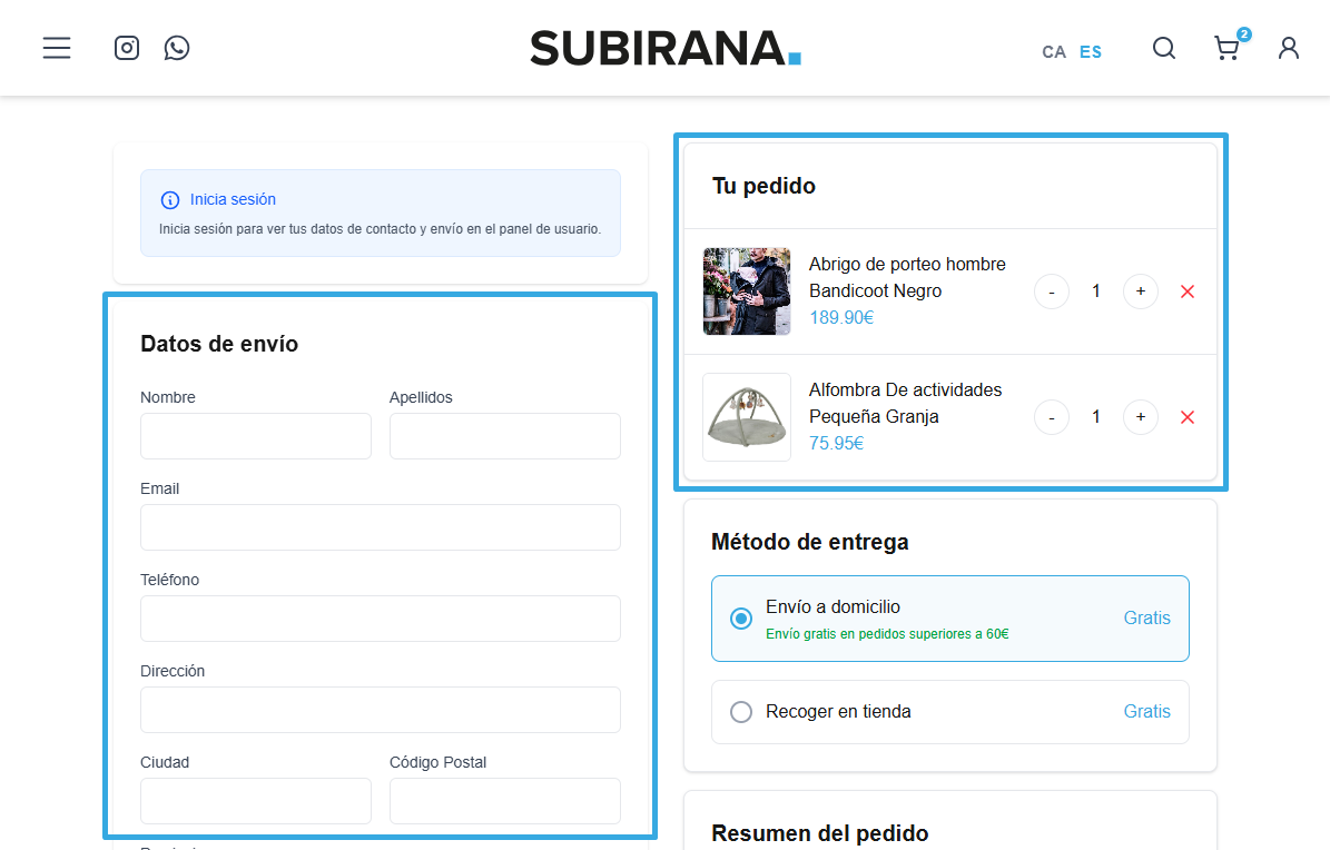 - Rellena los datos de envío y asegúrate de que tienes los productos que deseas.