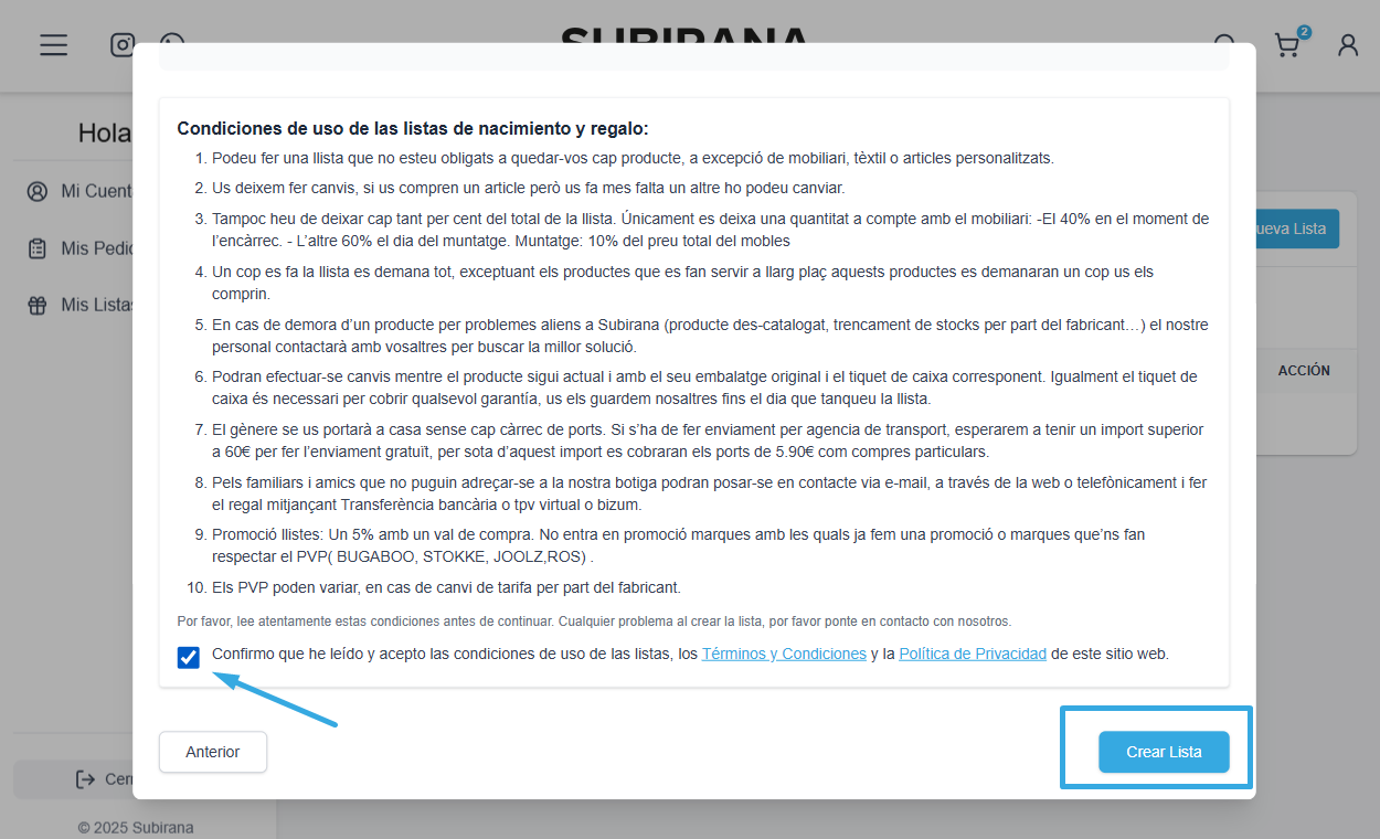 - Lee las condiciones, marca la casilla y pulsa el botón CREAR LISTA . Aparecerá tu lista en el panel.